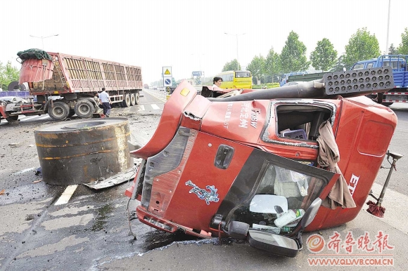 卷板的货主告诉记者,事故发生前10多分钟,大货车刚刚装车从基地出发,车上共装有3个卷板,准备运往德州,每个卷板大约有10吨重。他也是刚刚接到消息,赶到现场,对事故原因并不清楚。