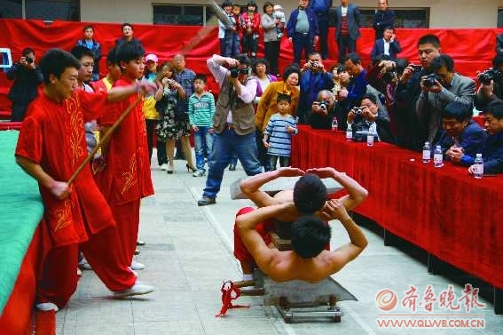 5月18日,狗娃艺术团在郓城水浒好汉文化城“万人游水浒首发团”表演武术。据介绍,该团由来自济南的200多名游客组成,郓城县旅游局长黄波亲自当导游,为游客讲解古戏楼、孙二娘客栈等多个景点。据悉,今年为水浒古文化宣传年,“万人游水浒”启动仪式将于19日在水浒好汉文化城举行。 本报见习记者 张歆然 摄影报道