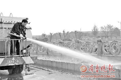 针对近期大风天气频繁、建筑工地施工粉尘多等问题,惠民县环卫局成立专业清洗公司,对城区内人行道、雨水口、景观桥等环卫机械无法作业的地段,安排人员进行高压清洗。目前已清洗人行道21条,景观桥5座。图为环卫人员清洗东环路景观桥。