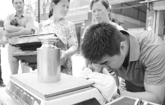商贩常先生介绍,他的这些秤买了两年多了,检定过一次,现在也不知道准不准,干脆挨个测一下。经技术人员检测,常先生的电子秤误差每10kg仅差四五克,在规定的误差范围内。