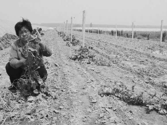 记者18日中午赶到蔺皋村,看到蔺清水家有4块地种的西瓜,共3亩多,其中3块地都扣着大棚,西瓜长势喜人,最靠边的一块地里瓜秧却枯萎发黄,已经蔫吧,瓜棚也撤了。