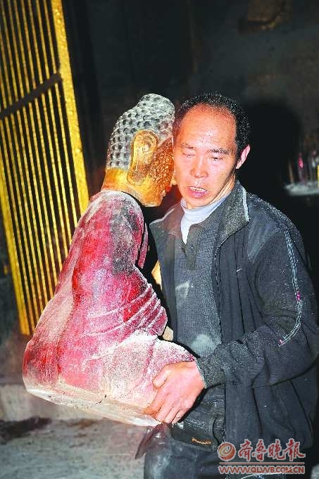 右图:赶来灭火的群众正忙着往外搬运佛像。