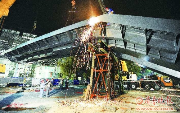 20日凌晨,在泉城广场与恒隆广场之间,一阵清脆的鞭炮声过后,长约21米、重达46吨的一段钢结构主梁缓缓跨过黑西路,稳稳就位。至此,恒隆广场人行天桥主梁吊装全面完工。