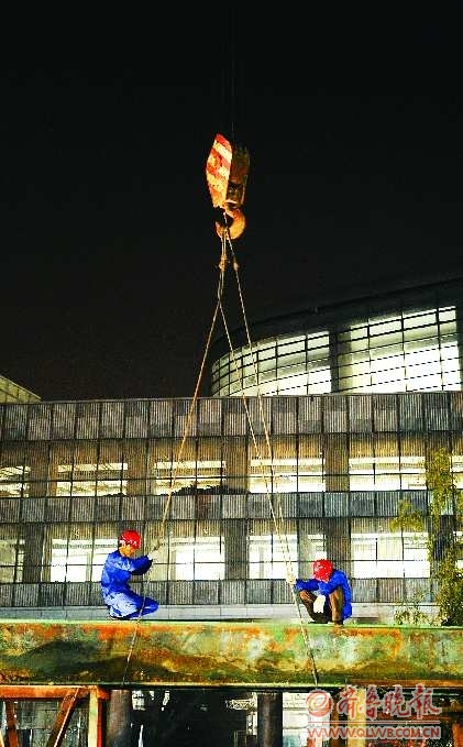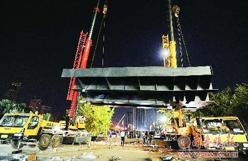 由于该桥地处繁华闹市,为不影响市民通行,从5月14日起,每晚10点半以后,100多名工人和技术人员在此开始“夜战”。经过工人们6个不眠之夜的奋战,该桥最终于20日凌晨成功合龙,比预期提前了一天。