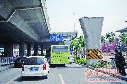 22日,记者来到二环东路高架桥荷花路路口附近,发现该处高架桥只在东侧设有下桥匝道。而与之相对应的西侧,施工方明显留下了上桥入口的位置,但却没有铺设桥面,只有一个桥墩立在上桥口处。由北向南的车辆无法从此处上桥,只得经由桥下车道通过,遇到信号灯时,车辆只能排起长队等待。