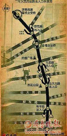 据了解,二环东路高架桥全线设四对上下桥匝道,分别设在和平路路口、山大北路路口、花园路路口以及荷花路路口。其中和平路匝口为东上西下,位于解放路以南、和平路以北的中间位置;山大路北口匝口为东下西上,花园路匝口为东上西下,只有荷花路路口处只能东侧下桥不能从西侧上桥。由北向南通过此处的车辆,只能绕到全福立交桥或山大路北口匝口上桥,给出行带来不便。
