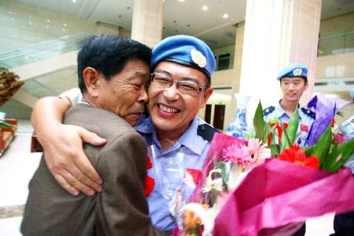 20日下午,刚下飞机的于波和父亲紧紧地抱在了一起。结束了在东帝汶370多天维和任务后,潍坊市公安局四名公安干警乘坐联合国包机,于20日返回祖国。5月20日下午,他们顺利回到潍坊,四名队员均被授予联合国“和平勋章”。