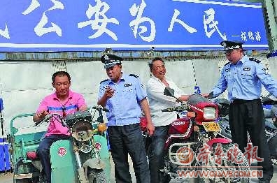 20日,邹城市居民张某、林某高兴地从该市公安局府前派出所民警手中,领回了几天前被盗的电动三轮车和摩托车。日前,府前派出所接到报警后,根据走访群众获得的线索迅速出击,一举打掉一盗窃机动车犯罪团伙,抓获犯罪嫌疑人两名,缴获被盗机动车7辆。 本报通讯员 宋广宇 摄