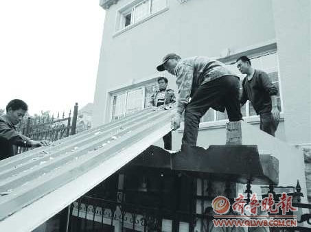 22日上午9点左右,记者跟随执法部门来到湛山一路7号,进入大院后就看见一处板房建在主楼和院墙之间,四五个工人正站在房顶对其进行拆除。这处院落是一家酒店,板房被用来当作员工餐厅。酒店工作人员范先生说,板房三个月前刚刚建成,八大关拆违工作开展后本想主动拆除,但是由于没有拆除工具只好请拆除工人上阵。半个小时后,板房顶部已经被拆除。