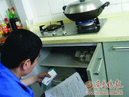 泰能天然气工作人员在一居民家中检查其燃气设施。 记者 苑菲菲 摄