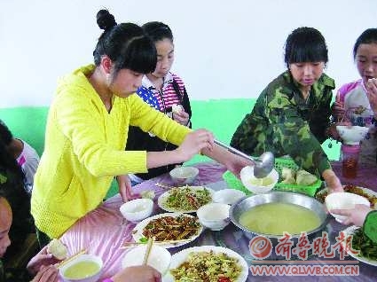 在另一张桌子上,记者看到有一名五年级的女同学吴旨骐在为其他低年级的小同学分汤。她不慌不忙地接过同学们递过来的碗,将汤搅匀了之后盛好,再递给下一位同学。当盛到自己的汤时,盆里已经没剩下多少了。看到她没有汤,周围的同学纷纷表示要把自己的汤分给她。看到同学们这样互帮互助互相谦让,站在一边的刘老师告诉记者:“这些孩子都是独生子女,能这样不争不抢的,真是出乎我的意料。”