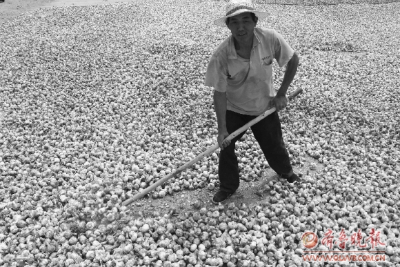 在白浮图镇丁庄蔬菜批发市场,金乡华顺商贸公司负责收购的姚平正忙着把收购来的大蒜过秤、记账、支付蒜农现金。他告诉记者,他做大蒜生意已经七八年了,每年都会到成武县收购大蒜,然后运回公司晾晒、加工、外销。