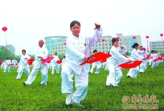 5月20日上午,滨州市第三届群众体育大会暨首届全市机关运动会开幕式在滨州职业学院体育场内举行。在开幕式上,滨州市太极拳协会的200位老人献上了壮观的太极扇表演。