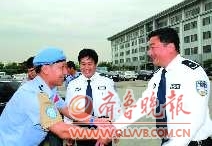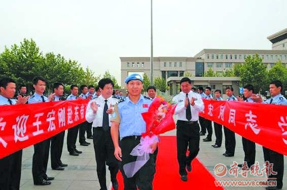 5月20日下午,一辆黑色轿车驶入滨州市公安局大院。车刚停稳,一名身着警服、头戴贝雷帽、佩戴联合国臂章的民警走下汽车,早已迎候在此的滨州市公安局政委单立新紧紧握住这位民警的手,现场爆发出热烈的掌声。这名民警,就是刚从东帝汶执行联合国维和任务归来的滨州市公安局特警支队副支队长王宏刚,这已经是他第四次执行联合国维和任务。