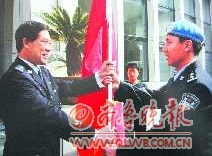 2010年5月,王宏刚在出发前接受山东省公安厅厅长吴鹏飞授旗(资料片)。