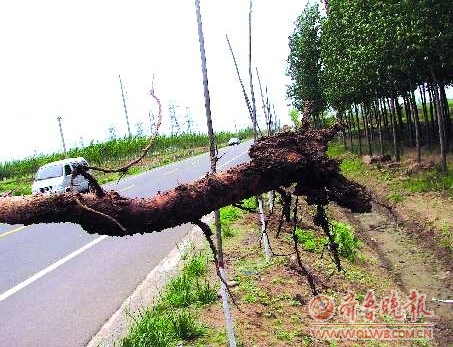 据即墨到七级镇的客车售票员介绍,自从前几年道路拓宽后,这条路两边一直没绿化。今年4月,从大信镇到七级镇15公里左右的县级公路两侧全都栽上了小杨树,同时栽种的还有围村林。时隔一月,围村林都好好的,行道树却成了这个样子。