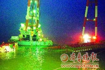 5月20日22点56分,2艘大型浮吊船开始起钩扳正沉船。5月21日凌晨1点26分,沉船扳正完成,扳正后沉船艏部漂浮在水面上,艉部搁坐在海底。