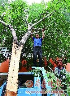 5月24日,德州市园林处工作人员对湖滨大道上一棵因17日大风折枝的行道树进行树冠修剪, 防止意外发生。