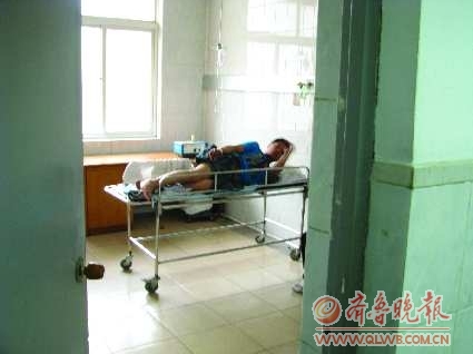 记者在浮新医院的抢救室看到,受伤的小伙子躺在病床上,上身穿一件蓝色的T恤,领口撕开一道口子,下身只穿一条内裤,用一条没有皮带的牛仔裤盖在身上,右胳膊上一道长约15公分的口子,双脚脚踝处红肿。陪在床边的一名李姓中年男子说,一个朋友让他过来看着这个小伙子。记者询问受伤小伙子时,他不停地瞄着陪同的中年男子,默不作声。