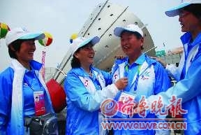 24日,在钻石体育场外,来自七彩华龄老年志愿团队的65岁志愿者王孟华(右二)等4人高兴地穿上了志愿者服装。据了解,他们是此次苏迪曼杯志愿者中一个特殊的团体,一共12人,平均年龄在56岁,他们都有服务奥运、全运等大型赛事的经验。 本报记者 张晓鹏 摄影报道