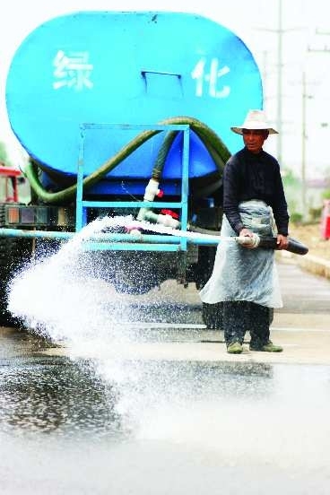 5月24日,罗庄区盛庄街道红土屯社区湖北路上,一辆洒水车正在清理马路尘土,为即将到来的临沂市创建国家卫生城市迎评做充分的准备。