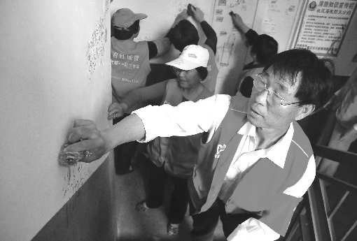 记者在现场看到,楼道里有的地方胡乱张贴的小广告贴了一层又一层,而且粘得很紧,一时之间很难清理干净。只见焦胜东把胡乱张贴的小广告喷上水浸湿,然后用钢刀刮掉,再用抹布抹干净楼道的墙壁,最后把刮掉的广告打扫干净。
