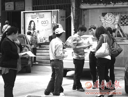 发放祛痘产品广告单的小李介绍,她发传单的工资是一天35元,将顾客带去店里有10元的提成。本来这种产品主要针对年轻女性,但她顾不得观察行人的脸上是否有痘,见人就给。小李称,她也知道需要选择合适的对象,以减少因乱发带来的浪费,但那样效果甚微,只好采取漫天撒网的方式。