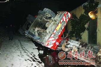 山亭消防大队接到报警后,立即出动一辆抢险救援车和七名官兵赶往事故现场。消防官兵到达现场后发现,一辆大型吊车翻倒在狭窄的水泥路上,大量柴油顺着侧翻的车辆流出,司机被侧翻的车辆压住下半身不能动弹。