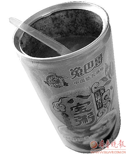5月23日,李先生在光明路一家连锁超市买了一罐产自淄博的罐装兔八哥木糖醇营养八宝粥。24日中午,李先生拉开罐刚吃了一口,就发现罐体内壁竟然附着着黑色的一层斑点。