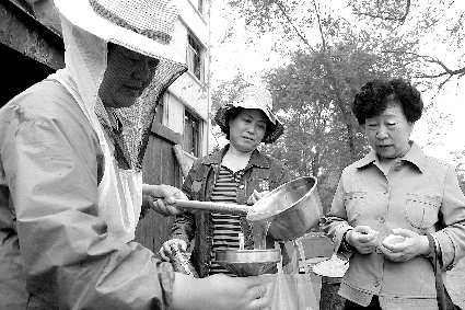 经过一个多小时的忙碌,摇蜜机里有了很多蜂蜜,老杨将这些蜂蜜过滤,盛放在一个大的蜂蜜桶里。然后,他用舀子将蜂蜜倒进购买者带来的蜜罐里,开始过秤、收钱。
