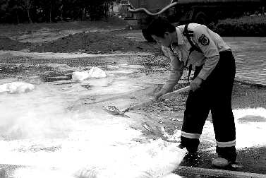 24日下午,在沙营转盘,记者在现场闻到一股刺鼻的味道,路面有大面积的盐酸冒着泡。据了解,下午3时许,一辆运输低度盐酸的重型罐车在沙营转盘自南向西左转时,由于行驶车速过快,导致牵引的罐车侧翻泄漏。盐酸泄漏位于路面右边,污染面积大约长100米。东营消防支队直属一中队的消防官兵立即赶来救援。现场消防人员说:“盐酸对路面的损害比较大,与路面会发生化学反应,路边的一些树木也会被烧死。”