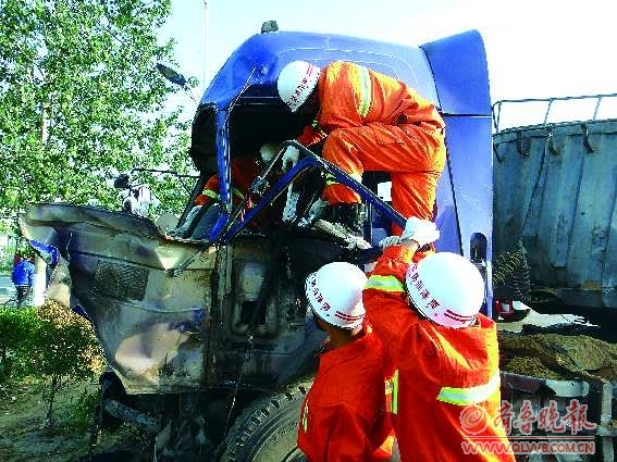 本报6330000热线消息(见习记者 景佳 周千清 通讯员 宋聚新) 5月23日上午,一辆拉沙大货车与另一辆空车行驶的大货发生碰撞,结果,空车车体变了形,还将司机卡在了驾驶室。