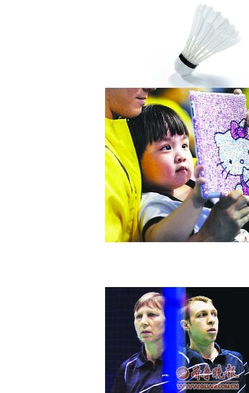 在本次苏迪曼杯上,“风云组合”之一的男双选手傅海峰将3岁的儿子傅子瑜带到赛场,可爱的西瓜太郎头型配上圆圆的小脸,外号“小鱼儿”的傅子瑜在赛场一亮相就成为最抢镜的小明星,总是会被这位或那位世界冠军所包围,“小鱼儿”却很少买这些“大明星”的账,天真无邪的话语时常逗得大家放松一笑,被队员们当做名副其实的“开心果”。图为傅子瑜在父亲怀里玩游戏。