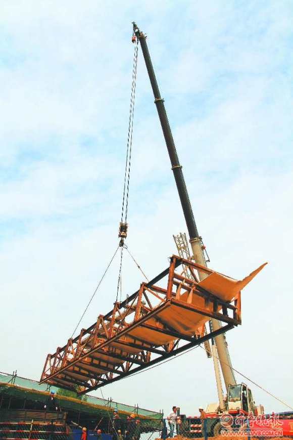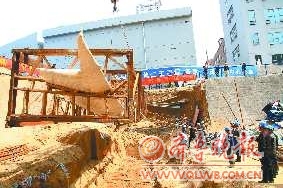 小图为古船被吊离现场。大图为古船准备装车。 本报记者 徐升 邓兴宇 摄影报道