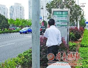 5月25日,烟台路一公交站牌竖立在远离站点的花丛内,市民不得不走进花池内查看公交站牌,破坏了绿化带植被。 本报见习记者 张照朋 摄影报道