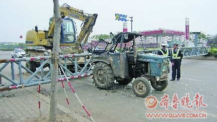 5月25日上午8点15分,记者赶到现场发现,交警正在事发路段疏导交通。记者看到,20余米的限高架被撞断后横在路上,“闯祸”的拖拉机被掉下的限高架一分为二,拖拉机的驾驶室被砸变形,驾驶室周围散落着很多玻璃碎片。