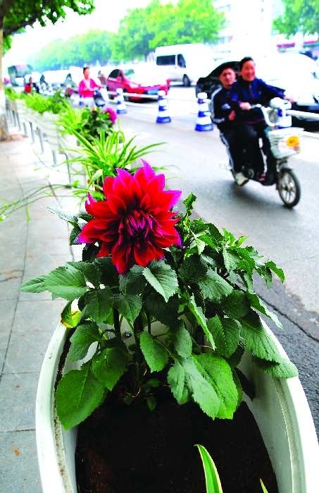 25日,沂蒙路与金雀山路交会路口,“花篮式”护栏上放置了数百盆鲜花,形成一道靓丽风景。经过近几天的施工,该处路口四个拐弯处的护栏基本安装完毕,并布置上了花卉。“花篮式”护栏的设置既规范了道路行车秩序,又美化了城区环境。  本报记者 罗志强 摄影