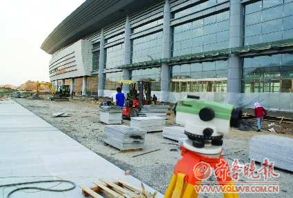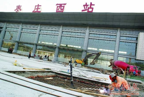 25日下午6时30分,记者在京沪高铁枣庄站施工现场看到,无论是站房内,还是场外的站前广场,都是一派繁忙的景象。站在站前平台上,面向正西,只见一个宏伟的船形状的站房拔地而起,而“枣庄西站”四个红色隶体大字立在站房房檐上,十分醒目。