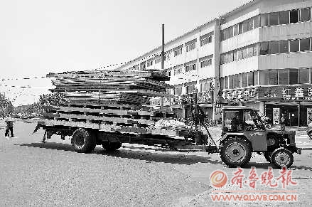 在铁西机床厂附近,一辆满载木材的拖拉机行驶在公路上。记者看到,一层又一层的木材堆积在一起,有近二十层,而车主仅用一根铁丝将木材捆绑在一起,晃晃悠悠的,让人心惊胆战。