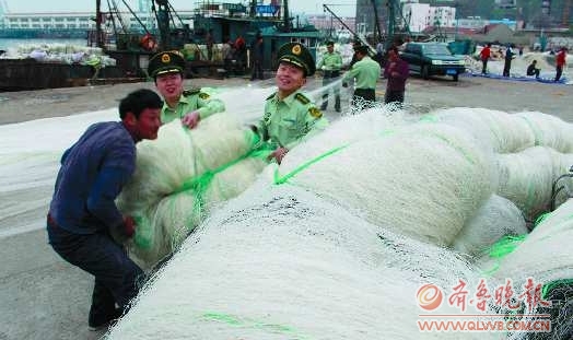 黄渤海域休渔(6月1日)在即,荣成部分渔船已经返航靠岸,整理渔具,准备休渔。25日,荣成边防大队石岛边防派出所官兵帮助返航的渔民整理网具。