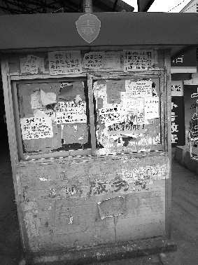 在宏达市场,工商服务亭贴着野广告,东侧勉强可以看到“公平秤”字样。从外面看不到里面究竟放些什么。在红利市场,记者同样看到一座锁着的门,服务亭似乎已经废弃,公平秤不见踪影。