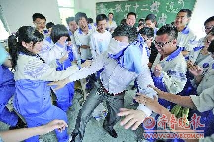 26日下午,济南中学高三八班,同学们跟班主任(中)在课间一起做“蒙眼过障碍”游戏。临近高考,该校高三老师利用课间和学生做游戏、进行心理辅导等,为学生舒缓平日紧张的情绪。