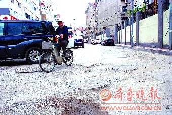 26日下午,记者在东青龙街看到,从教师之家向北,路面坑坑洼洼,部分柏油路面已经被刨开,施工造成的泥沙、尘土到处都是,一有车辆驶过便会尘土飞扬。记者看到,该路段大约一千米左右,几乎成了半拉子工程,井盖明显高出路面,几根电线杆矗立在马路中央,往来车辆及行人全都小心翼翼地绕“杆”而行。