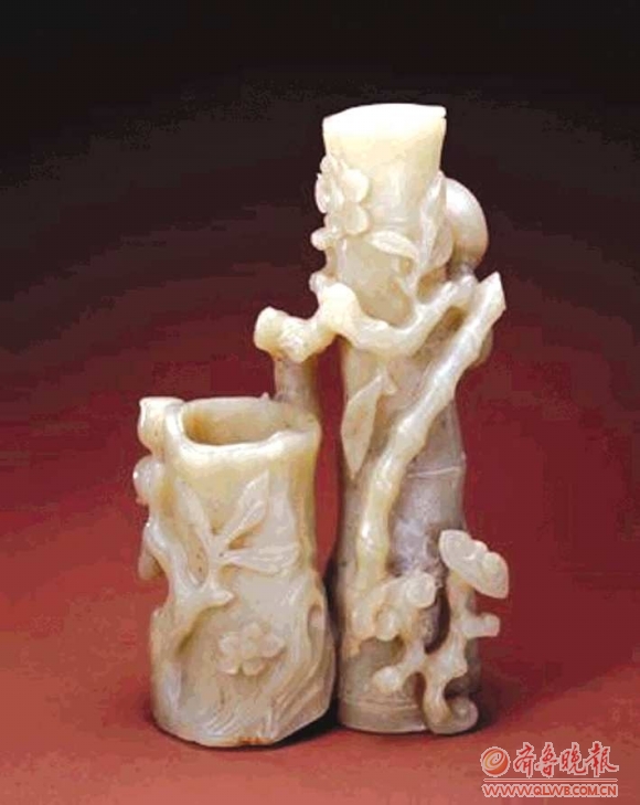 笔插青玉制,色略暗。形制为竹节及桃桩相连式,竹节略高,内空,其外有小竹枝、灵芝相附。桃桩与竹节相并,内空,其外有桃枝、桃叶及果实,一桃枝伸展,连于竹节之上,桃桩下部饰兰花之花叶。笔插是文房用品,管内可插笔或其它物品。明代,室内陈设及文房用品中多有此类作品。笔插取竹、桃、兰、芝之形,以象征君子之德。此作品造型高低错落,生动逼真,是明代玉器中的精品。