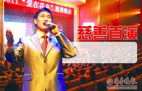 5月26日,菏泽2011“爱在花乡”慈善晚会在菏泽大剧院举行,截至当日下午3时,菏泽全市共接收“慈心一日捐”捐款10687万元。作为菏泽慈善形象大使的朱之文在晚会上演唱了两首歌,这也是“大衣哥”首次参与慈善演出。图为朱之文演唱成名曲《滚滚长江东逝水》。