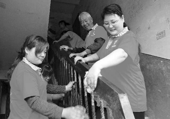 5月26日上午,12名“百姓城管”队员身着红体T恤,与怡园小区居民一起打扫楼道卫生,擦拭楼梯扶手。短短一上午的时间,该小区12栋楼被清洗一新,住户纷纷表示楼梯干净了,心情也好了。