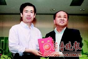 聊大校长李喆为张炜(左一)颁发聘书,聘为聊城大学荣誉教授。 本报记者 李军 摄