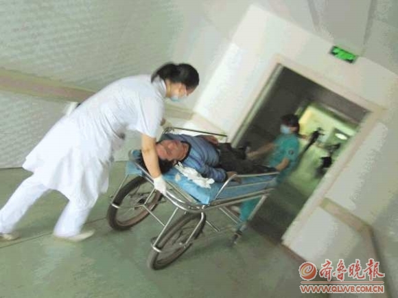 26日下午1时许,记者赶到兴华路与站前街交叉口附近,看到三名医护人员正把一名男子抬上急救车,现场有十几名市民围观,一名女子对急诊医生说,她是男子的妻子,要求随同急救车去医院。