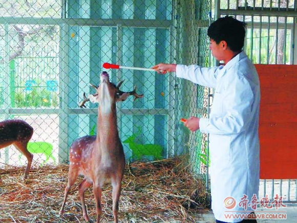 28日上午,刘公岛国家森林公园将举办开馆仪式,两对台湾“宝贝”———梅花鹿繁星、点点和长鬃山羊喜羊羊、乐羊羊在开馆仪式后正式与游客见面。图为27日饲养员通过手中的指挥棒对“繁星”进行亲近训练。 本报记者 冯砚农 摄