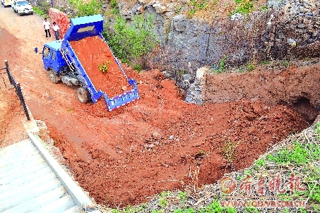 从上午10时开始一直到下午,物业公司调用农用自卸车从小区附近取土,回填到“大洞”里,再由挖掘机施工作业,将回填的土方不断平整、夯实。到下午3时许,农用自卸车共运了15车土。根据施工人员估算,回填“大洞”的土方需200多立方米,自卸车每次拉载5立方米渣土,往返需要40多趟。凤鸣山庄物业负责人田经理表示,他们当晚会加班加点,把回填所需的土方全都运输到位。